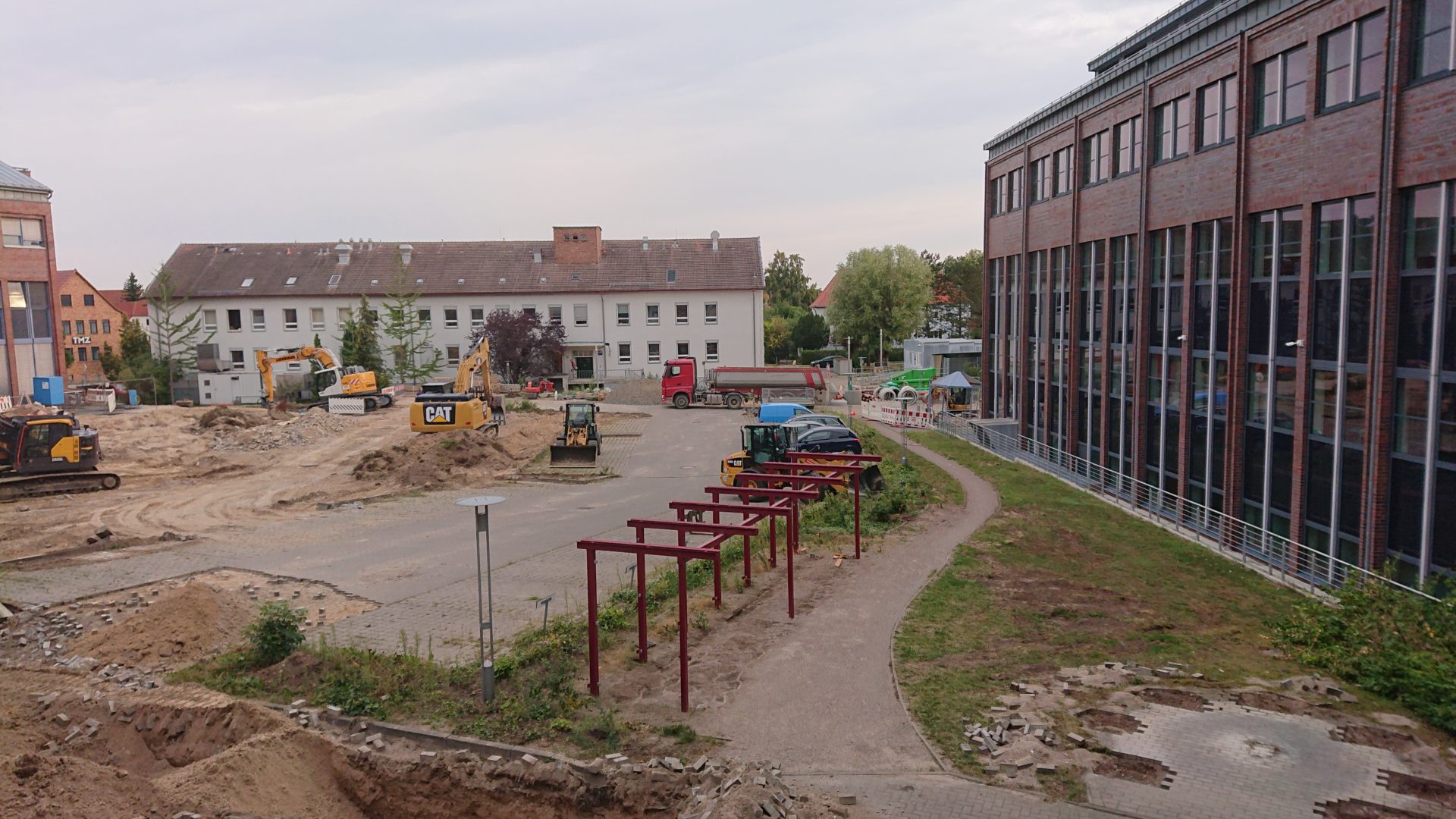 Gestern ist nicht viel passiert auf dem Hof. Der Platz ist immernoch nur halb beräumt, die Arbeiten konzentrieren sich auf die Rampe der Baustellenzufahrt. Der erste Bagger wurde schon wieder abgeholt. Allerdings wurde ein Erkundungsgraben gezogen, wohl um festzustellen, wie tief und wo die Leitungen für die alten Lampen liegen.