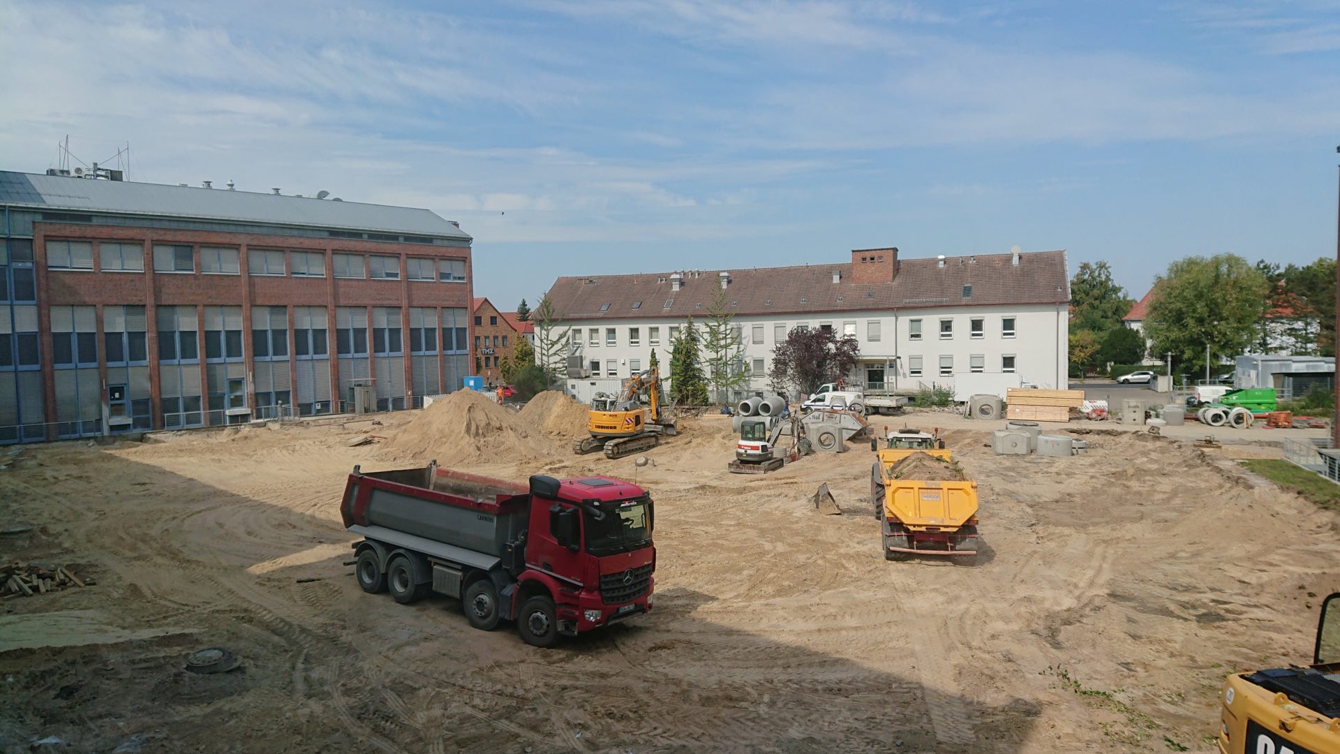 Heute ist das letzte Grün auf dem Hof beseitigt worden – wir haben jetzt eine schöne staubige Wüstenlandschaft vor dem Fenster (passend zum spätsommerlichen Wetter). Mittlerweile wird mit Traktoren gefahren – es sind ja jetzt auch eher aus wie ein Feld. Ansonsten sind weitere monströse Kanalteile angeliefert worden – die müssen jetzt irgendwie unter die Erde…