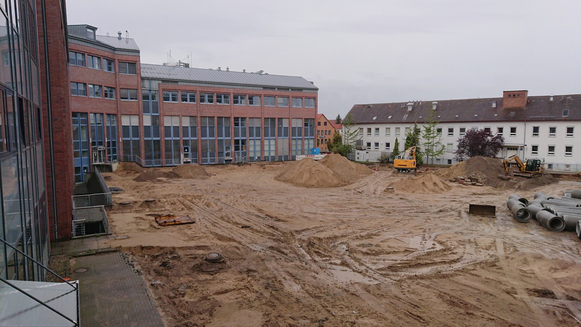 Aufgrund des starken Regens gestern und heute hat sich die Baustelle jetzt in eine Seenlandschaft verwandelt. Die Männer taten einem echt leid bei dem Wetter – heute durften sie dann schon am frühen Nachmittag Feierabend machen.Ansonsten geht die Baggerung des Grabens für den Regenwasserkanal auf der Nordseite weiter. Die Stahlprofile, die für das Abstützen der Baugrube an der Zufahrt genutzt und dort wieder entfernt wurden, sind genauso abtransportiert wie der zweite große Volvo-Bagger. Dessen Aufgabe war wohl ausschließlich das Ziehen der Stahlprofil-Stützen, da er das entsprechende Werkzeug “dabei hatte”.