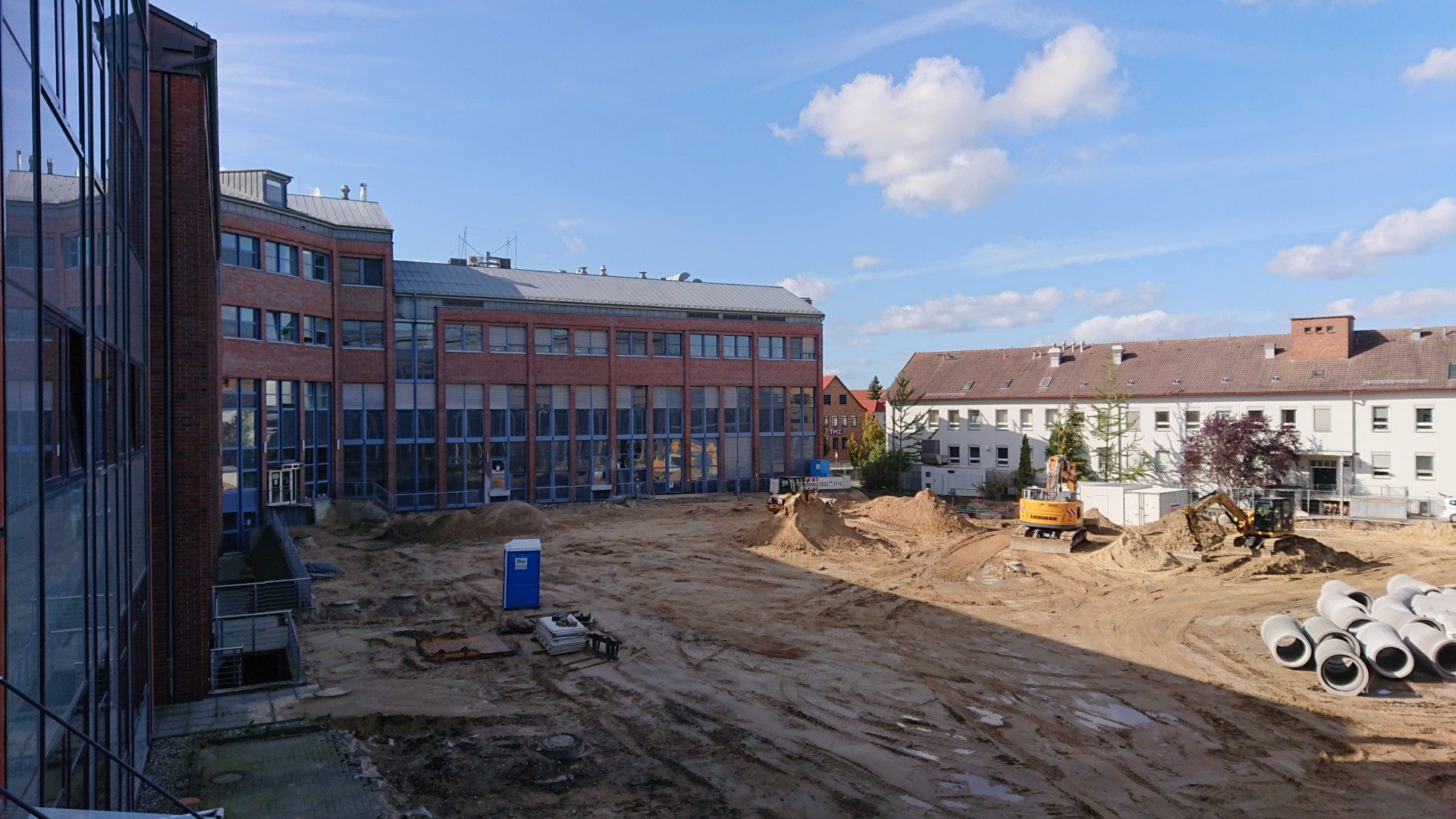 Wie in den Vorwochen ist auch in dieser Woche bis Mittwoch nur relativ wenig passiert. Und nach der donnerstäglichen Bauberatung haben dann wieder alle beteiligten Firmen so richtig losgelegt. So wurde die Grube unter der zukünftigen Baustellenzufahrt verfüllt – dort stehen jetzt die Baustellen-Container. Diese mußten nämlich weichen, da der Graben für die Kanalisation jetzt bis vor den Nordgiebel des INP geht. Außerdem wurden Teile der Berglandschaft des Aushubs abtransportiert und weitere Beton-Kanalisations-Fertigteile angeliefert.