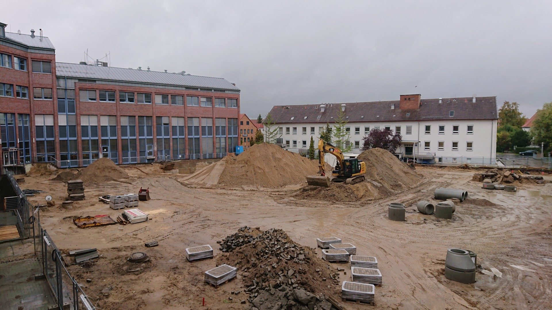 Aufgrund des Regens am Mittwoch und am heutigen Freitag ist in der zweiten Wochenhälfte eher wenig passiert. Das letzte Stück des Grabens am Nordgiebels wurde fertiggestellt und abgestützt. Dort wurden heute zum Feierabend die Kanalisationsrohre angeschlossen. Während der gestrigen Trockenphase verschwanden dann auch die langen Rohre, die einige Wchen auf dem Hof lagen, in der tiefen Baugrube unter der zukünftigen Zufahrt zur Tiefgarage auf der Biotechnikumsseite des Hofes. Heute wurden einige LKW-Ladungen des ersten Sandberges abgefahren. Die angelieferten Kanalisationsteile auf dem Hof reichen aber nicht für eine komplette “Hofrunde” – ob hier vielleicht alte Installationen weiterverwendet werden? Es würde allerdings wenig verwundern, wenn Montag weitere Kanalisationsfertigteile angeliefert werden würden. Die alten Schachtdeckel sind ca. 1m höher als das Bodenniveau und teilweise bereits während der Arbeiten beschädigt worden.