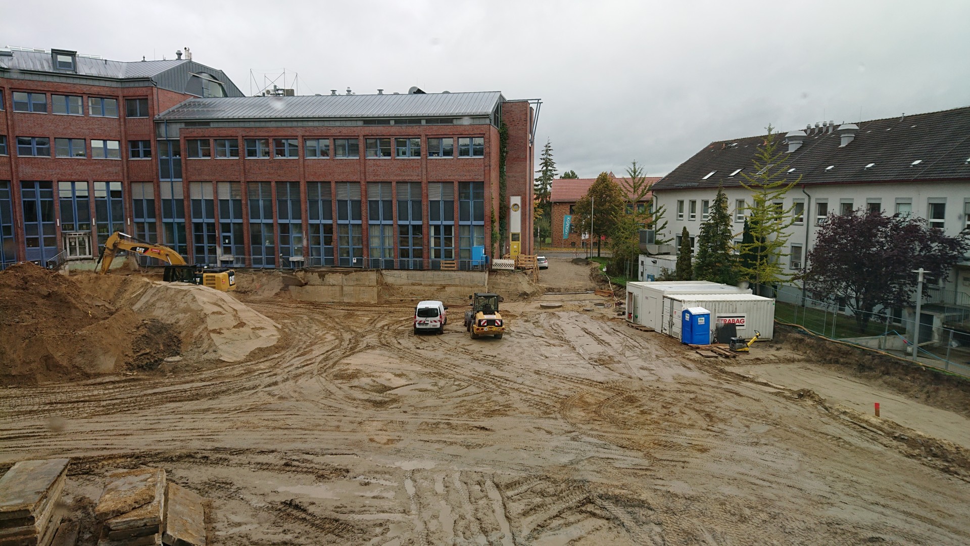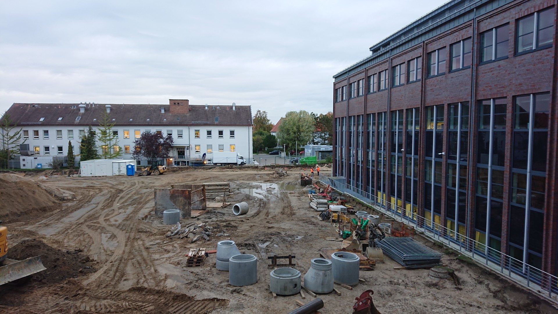 In dieser Woche gingen die Arbeiten an der Platzrunde der Abwasser-Kanalisation weiter. Mittlerweile liegen die Rohre auf der Südseite des Hofes und sowohl dort als auch auf der Westseite vor dem Biotechnikum wird der Graben bereits wieder verschlossen. Außerdem ist das Bodenniveau jetzt überall in die Horizontale gebracht worden – nun sieht man, dass das Biotechnikum fast ein Stockwerk höher vom Grundniveau her liegt als das INP.
