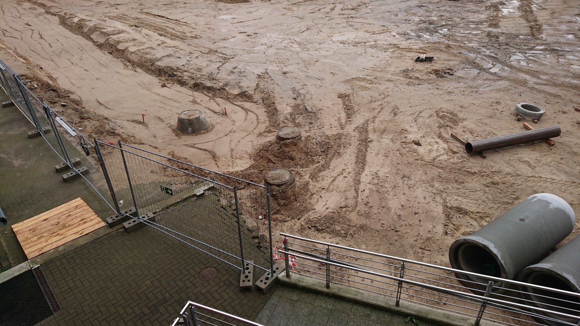 Ende des Monats sollen nun doch endlich die für Oktober angekündigten Verbauarbeiten mit dem Bau der Spundwände für die Baugrube beginnen. Bis dahin müssen die Arbeiten an der Kanalisation abgeschlossen sein. Trotz der durch das herbstliche Wetter und dem damit verbundenen Regen bedingten oft nicht einfachen Arbeitsbedingungen haben die Bauarbeiten Anfang der Woche an einigen Stellen hinter dem INP und auf dem Hof noch einmal die Gruben geöffnet um Änderungen vorzunehmen, danach (mit Ausnahme des Bereichs der Westseite des Hofs) die ausgebaggerten Gräben final verschlossen und den Boden verdichtet. Der Bauschutt der alten Kanalisation wurde ebenso abtransportiert wie große Mengen des zwischengelagerten Kies.