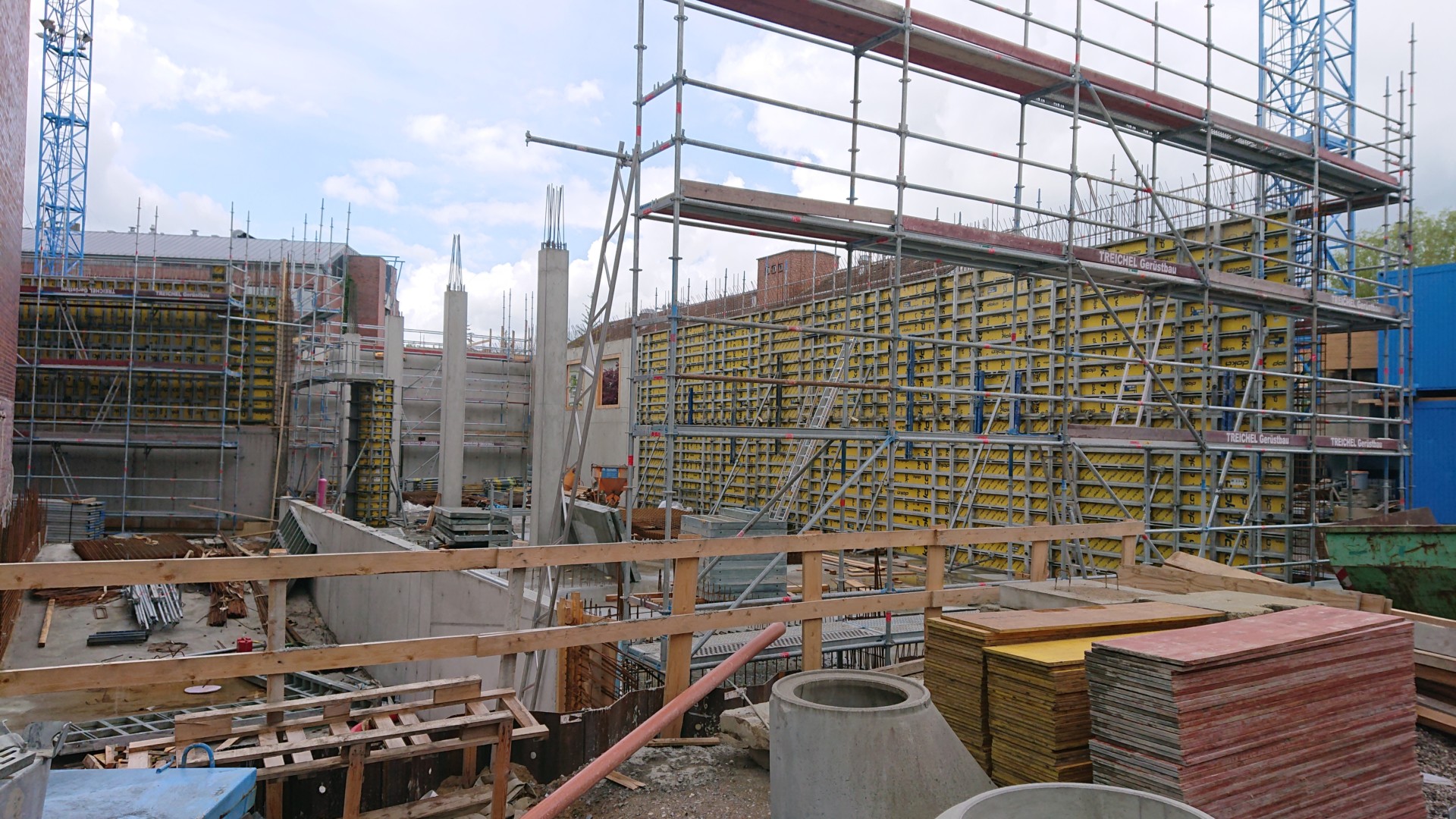 Die vergangenen zwei Wochen beinhalteten auch das verlängerte Himmelfahrtwochenende. Aufgrund der hauptsächlich osteuropäischen Bauarbeiter bedeutete dies aber keinen Stillstand auf der Baustelle. Mittlerweile ist das erste Obergeschoß des Bürostrakts fertiggestellt und auch schon die dazugehörige Decke teilweise gegossen. Auch am Übergang zum Biotechnikum sind jetzt die Vorbereitungen abgeschlossen, damit der Bau der Wände dort beginnen kannt.Am Laborteil ging es in der letzten Woche ebenfalls weiter. Sowohl bei den kleineren Laboren als bei der großen Werkhalle am Nordgiebel des INP wurden die Schalungen für das Gießen der Stahlbetonwänder aufgebaut. Vermutlich wird die Kolonne der Betonmischer auch in den kommenden Wochen weiter rollen.